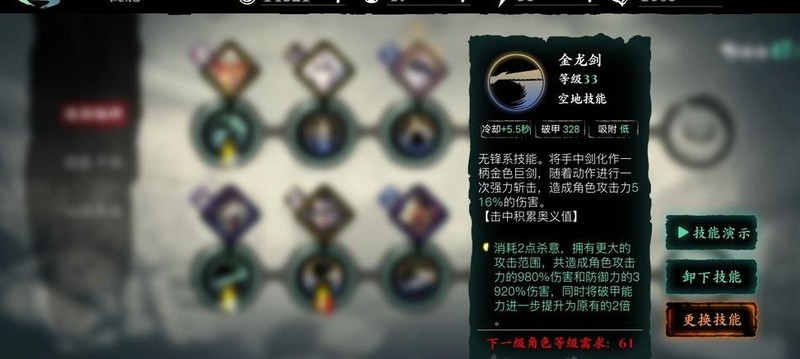 技能机制以金龙剑为核心输出手段,另一条链路仅作装饰。战斗中存在特定顺序限制,若先释放下链技能并叠加点燃状态,再使用上链金龙剑则无法造成有效伤害。常规打法依赖普通攻击破防或直接连续释放技能,操作流畅不易被打断。主要通过觉醒技叠加增益效果,其余技能均用于辅助金龙剑更顺畅地输出,同时配合相应心法提升整体伤害加成。