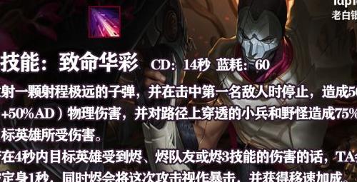 烬的被动机制独具特色:普通攻击受限于四发子弹,打完后必须进入一段较长的换弹动作,在此期间无法普攻,只能释放技能。这一设定使他成为爆发极高但容错极低的射手英雄。尽管无法像传统ADC持续输出,但他拥有独特的补偿机制——攻击力会依据攻速属性获得百分比加成,使得每次普攻伤害惊人,尤其是第四发子弹附带斩杀效果,威胁极大。此外,当他触发暴击时,还能获得显著的移动速度提升,这不仅增强了追击与逃生能力,也在一定程度上弥补了缺乏位移技能的短板。整体而言,烬依赖精准的走位与节奏把控,以换取致命的远程打击能力,是一名兼具策略性与操作难度的射手。