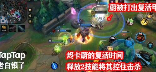 烬在后排精准预判蔚的复活时机,利用二技能将其控制,与队友协作完成击杀。
