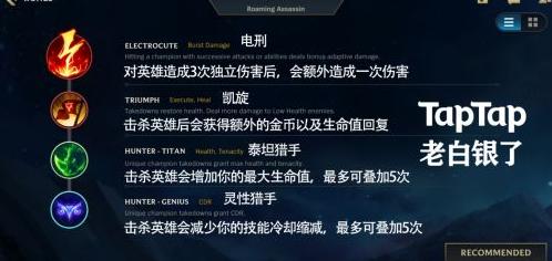 选择电刑提升爆发伤害,凯旋实现击杀回血与额外金币,泰坦猎手增强生命上限,灵性猎手则缩短技能冷却时间。
