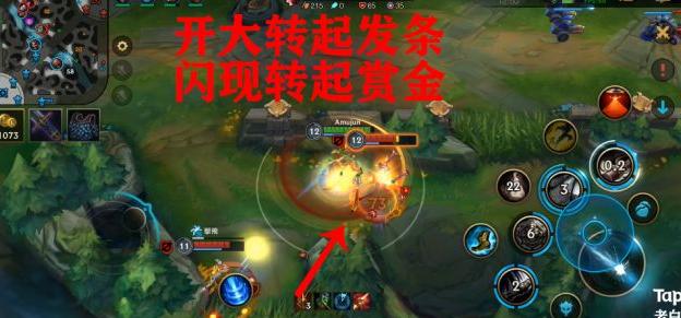 阿木近身后立即开启大招,先无视威胁较小的发条,闪现直接控住赏金。