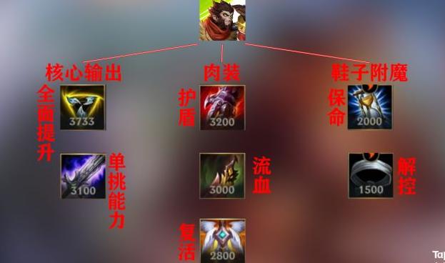 在装备选择上,首件建议优先考虑三相之力,它能全面强化猴子的各项输出属性,提升整体作战能力。第二件推荐血手,不仅增加生命值和攻击力,还能在低血量时提供护盾,显著增强生存能力。第三件可选择破败,提高攻击速度并附加吸血效果,有效加强持续作战与单挑实力。最后两件推荐死亡之舞与守护天使,前者将部分伤害转化为持续流血,降低爆发威胁,后者可在阵亡后提供一次复活机会,极大提升容错率。鞋子方面,根据敌方伤害类型选择布甲鞋或水银鞋,并搭配合适的附魔,金身用于规避关键技能,水银则帮助解除控制,灵活应对不同战局。