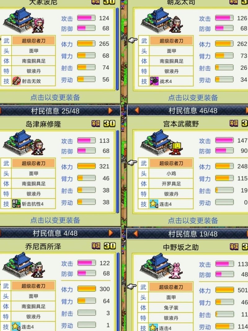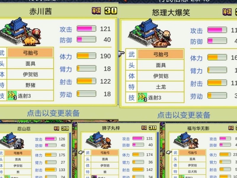 统一配置如下:除宫本和中野外,步兵与骑兵均装备南蛮具足和超忍刀,弓兵则统一穿戴伊贺铠并使用弓胎弓。个人历时十四年方才通关,月收入不足万元,前期操作生疏,局势一度紧张,但最终仍顺利通过。