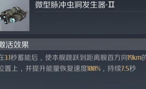 蓄能3.1秒后,战舰向前方19公里处跃迁,期间能量恢复效率提升100%,效果持续7.5秒。