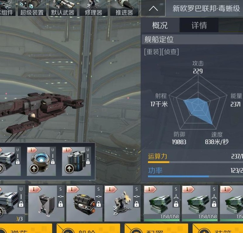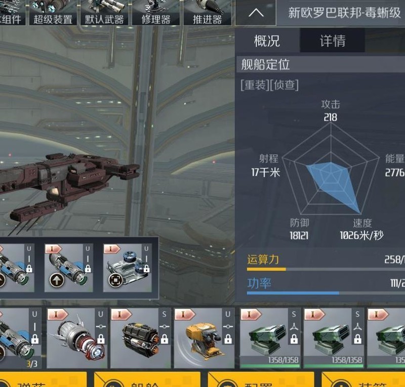 装置槽配备:微型能量恢复装置、离子推进单元、护盾充能模块。