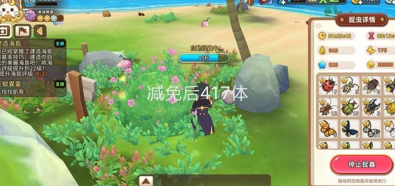 从图中可以看出,入门花蜜挂机的总收益为30880金币,花蜜成本为10次×175金币=1750金币。消耗体力525点,经减免后实际消耗417点,共减免108点体力。由此可测算出相关效率与收益比例。