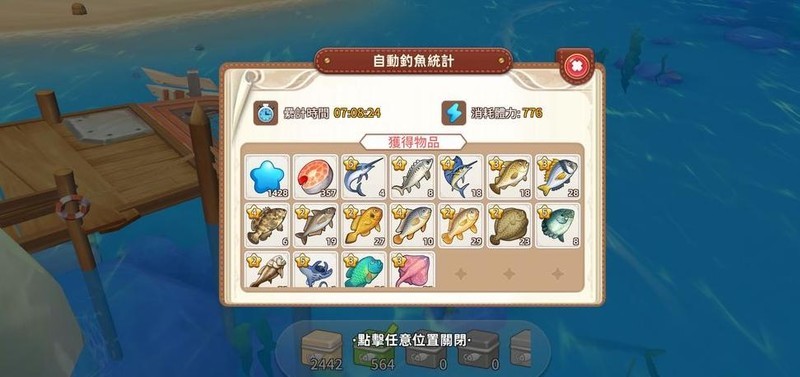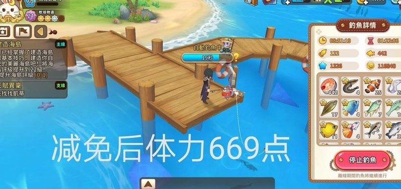 艾薇(女主播)钓点挂机收益情况最终展示,虽操作生疏,但减免后体力水印已标注。
