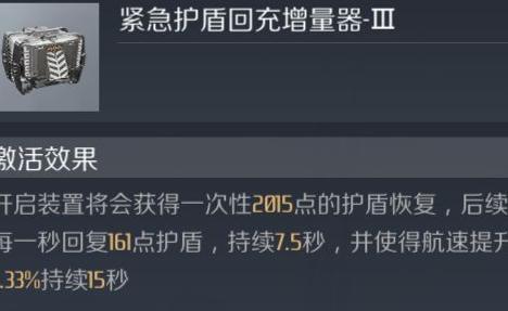 启动装置后,立即恢复2015点护盾,随后每秒持续回复161点,持续7.5秒;同时提升航速33.33%,持续15秒。上述效果中的护盾瞬回、每秒回复及航速增益均基于最高等级驾照的加成,为一次性强力增益模块,适用于紧急脱离或突进作战场景。