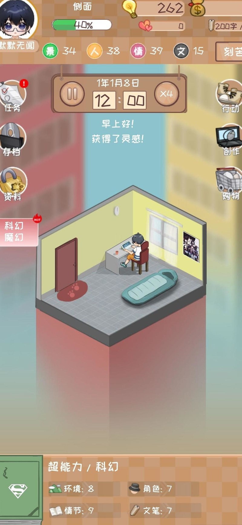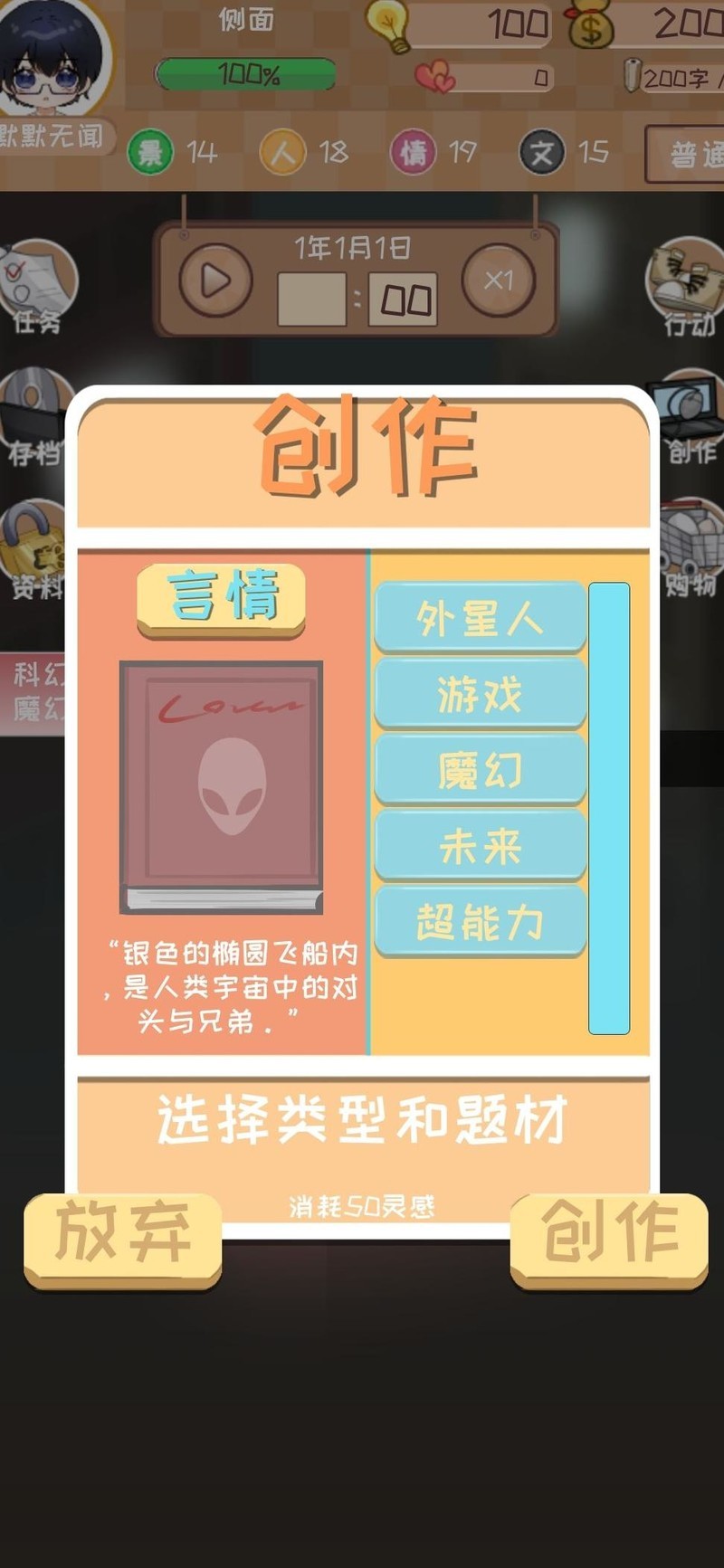 创作科幻题材的超能力作品,先领取两个500的任务(其余暂不领取),待四维生命升级后,再提升相应属性。
