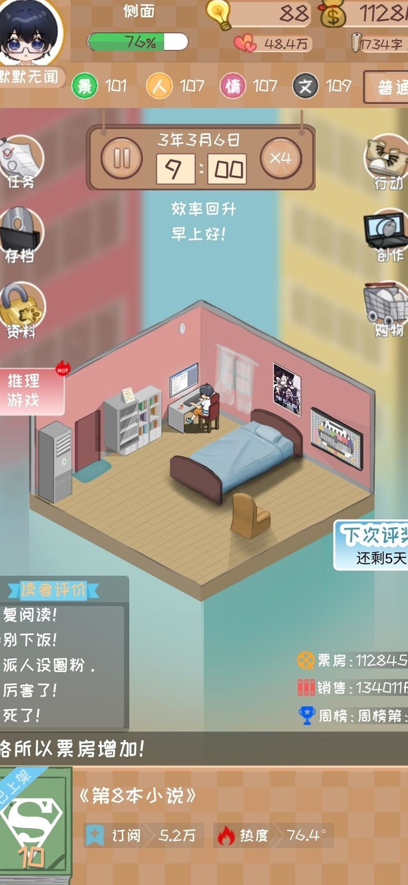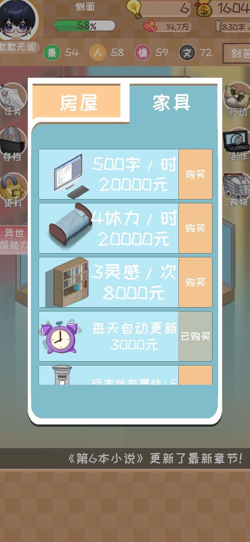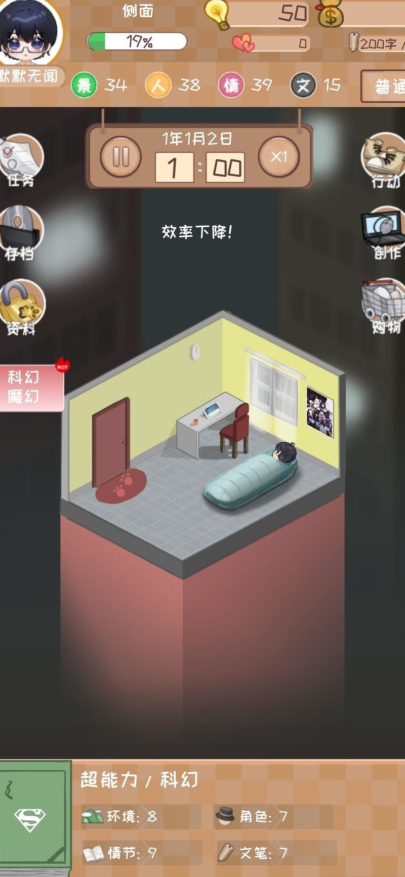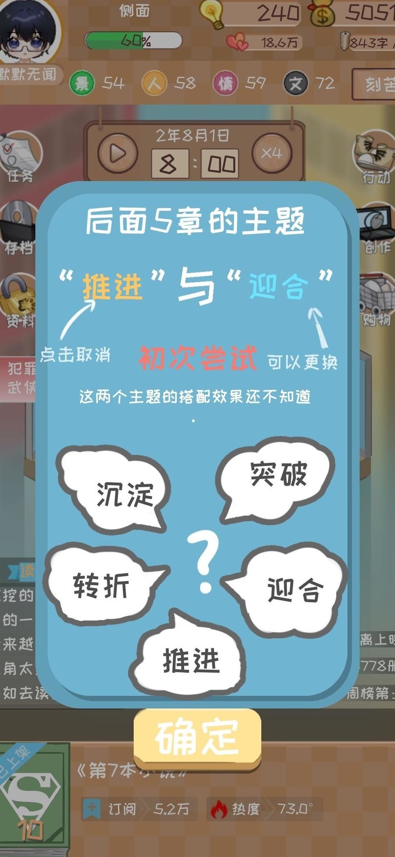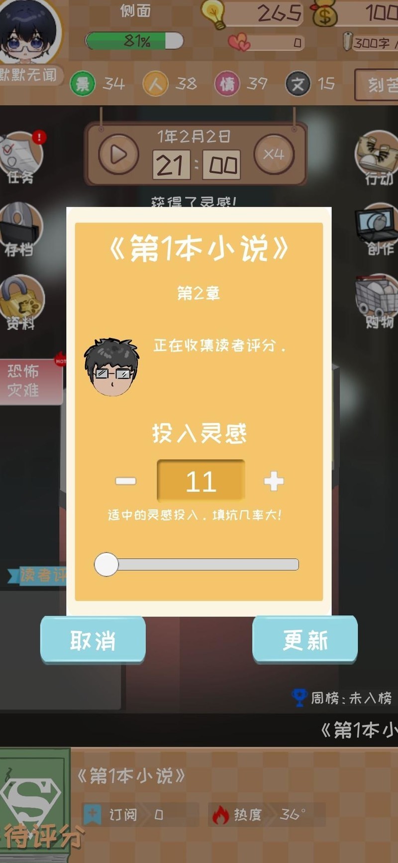 初始阶段四维属性评分未达满分,因此在推荐值基础上额外加3,原推荐11灵感则调整为使用14点灵感开启。优先领取所有可完成的任务奖励,并集中提升最后一项四维属性,确保四项均达到30以上。进入第二章时,系统建议灵感为12,实际直接采用15点灵感投入,后续章节依此类推。注意保持体力不低于30,否则进行写作将得不偿失。推进至第十章时,粉丝数量预计接近1000,此时调整策略为主动迎合市场偏好并积累沉淀,此举可提升获得千名粉丝的概率。粉丝数直接影响新书发布后的订阅增速、整体销量以及首日票房表现。鉴于当前版本前期订阅增长缓慢,建立扎实的粉丝基础尤为关键。首次获奖后应立即购置电脑床以提升效率。当灵感不足时,可通过观看两次获取灵感的广告来补充。