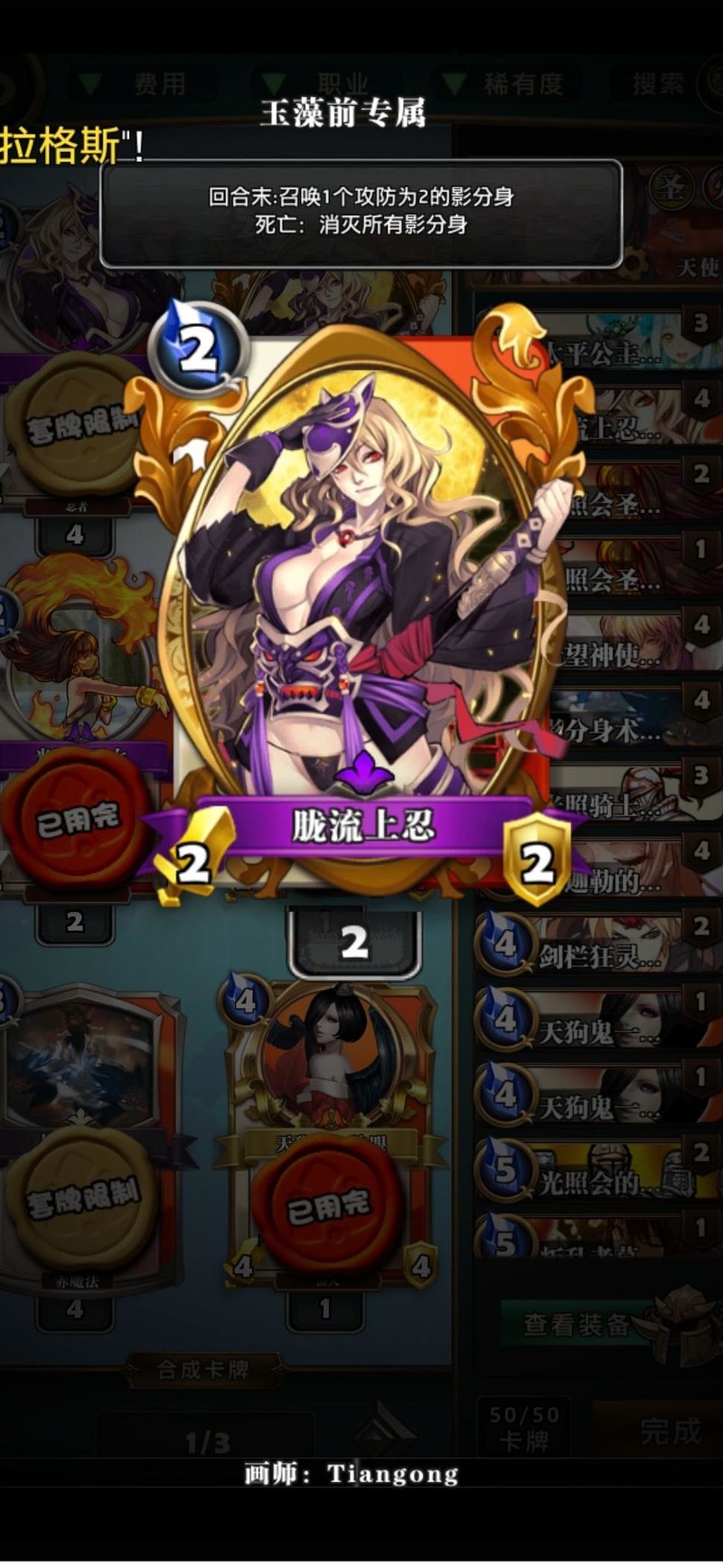 圣女配合卡组中大量天使牌,能持续补充资源,实现高效过牌,理想状态下可完全拉满,只因缺少一张未能达成。对战时若遇内战,2费时若手牌缺乏胧月上忍等优质选项,可将此卡置于6号位,对手通常也会将上忍放在此位,此时若有天使牌则稳赚,没有也不亏;若非内战,则建议等手中已有天使牌再使用,以确保收益最大化。