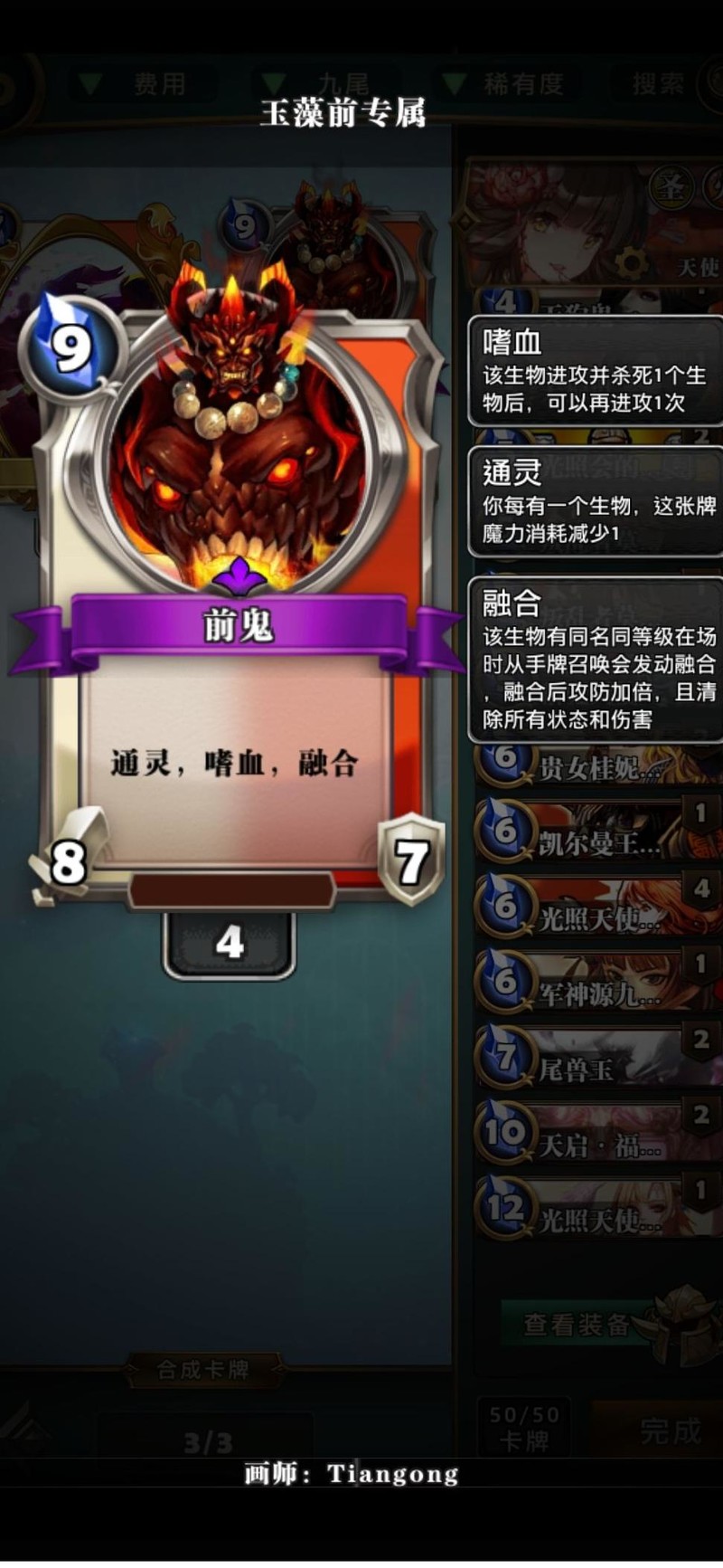 这张卡效果相当不错,具备通灵和回血能力,配合铺场尤为强势。由于卡位有限,我个人未携带,但若卡组其他位置有余裕,可考虑加入以增强场面压制力。偏好解场的则可选择玉,具体搭配可根据个人战术倾向决定。