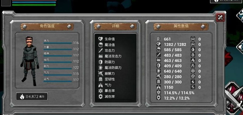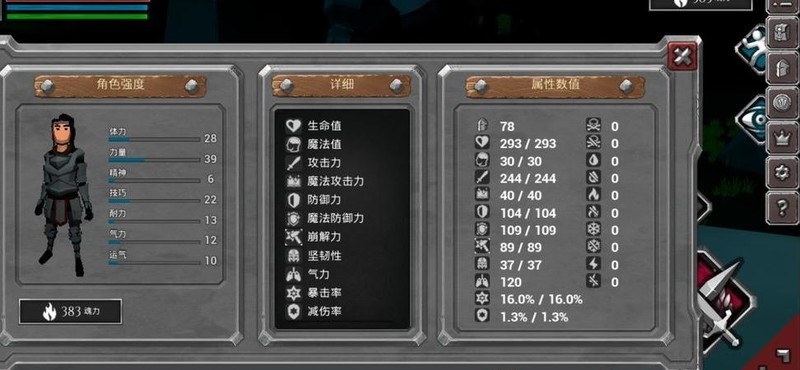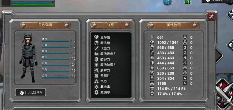 套装属性包含气力(当前无效,存在小缺陷)、耐力、力量、技巧及物理与魔法防御能力。