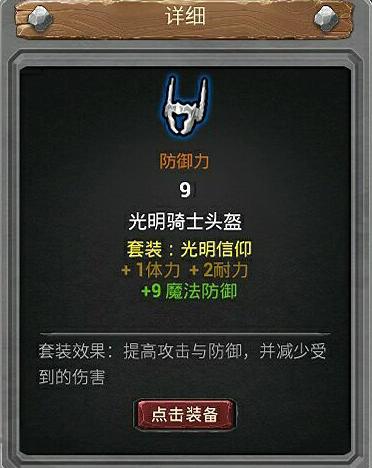 光明骑士套装属性详解:提升50点生命值,21点物理防御,仅增加1点魔法抗性、2点坚韧及5%减伤效果,未提供任何攻击加成,专注生存能力。