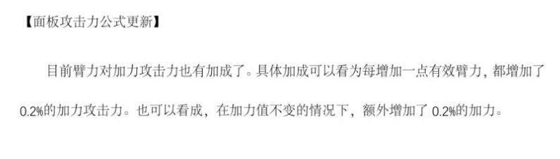 加力攻击力原计算公式为:加力值乘以加力攻击系数,再乘以(1+技能等级/500)后乘0.5。经优化后,每点臂力额外提升0.2%的加力攻击力,整体输出能力得到增强。