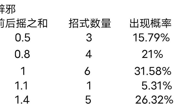 在前后摇不固定的武学招式中,某些动作出现概率极低。以辟邪剑法为例,共19招,仅一招的前后摇总和为1.1。练习时若能兼顾此类招式更佳,若难以顾及,可忽略不计。具体情况所示。