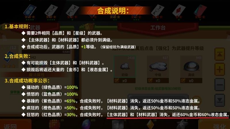 没错,关键就在于合成机制。经过多次尝试,我发现狙击类武器在合成金色品质时失败概率偏高(目前已准备进行第八次尝试)。不过,在反复失败中我总结出一个规律:当你连续失败2到4次后,系统往往会出现一次补偿机制,会适当提升成功率,让你成功一次。这像是系统在调节体验,避免玩家持续受挫。因此,建议把这种反弹机会用在最关键的装备上。我个人的做法是,将最珍贵的橙色武器留到感觉该成功了的时机再合成,因为橙武一旦合成失败,主武器和材料都会消失,损失巨大;而红色武器失败仅损失金币,相对可承受。我正是用这种方式,顺利将小丑和炮哥的橙武合成了红武,最终升至金武。可惜一把很强的狙击在冲击红武时失败,反倒为后续炮哥第二把金武的成功铺平了道路。这里所说的合成,特指橙武与橙武合成红武的过程,并非紫武升橙武阶段。以上是个人经验推测,仅供参考。