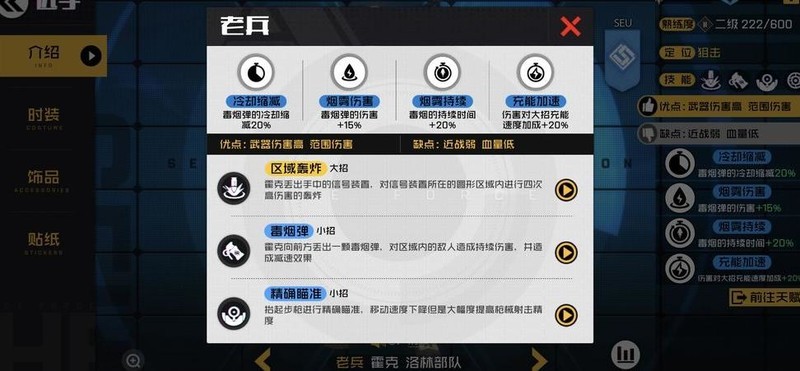 首先了解老兵的技能机制,其基础技能为投掷毒烟弹,可向指定方向释放,对范围内敌人造成伤害并附加减速效果。该技能最多可叠加五次使用次数,配合特定天赋后可实现多层储存与连续施放。