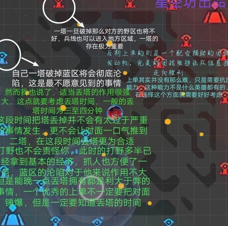 上路一塔一旦被破,蓝区将失守;对方一塔告破,则红区不保。一塔与野区息息相关,塔的得失往往取决于打野的发育情况。