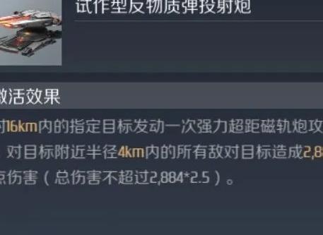 对16公里范围内的指定目标发动强力超距磁轨炮攻击,波及周围4公里内所有敌对单位,造成2884点基础伤害,群体总伤害上限为7210点。