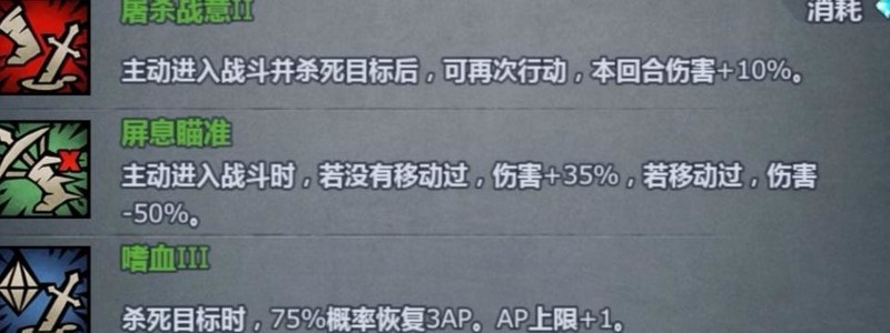 主要依赖嗜血技能,等级越高越强,三级嗜血有75%概率一回合击杀三人,56%概率击杀四人,配合激励效果,实战中常实现一回合斩杀七至八人,屠戮战意作用不大,可忽略。