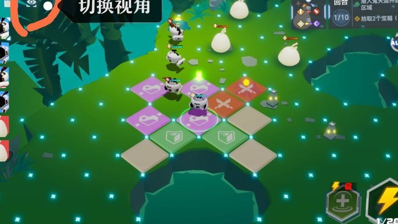 画面提供两个视角,俯视更清晰但人物较小,点击摄像机图标可自由缩放调整距离。