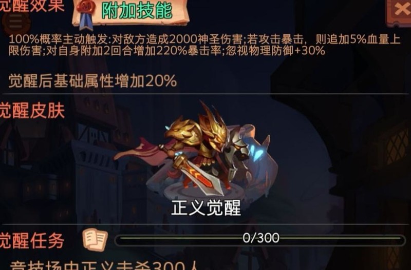 觉醒技能优先级最高,正义在觉醒后释放技能可附加220%暴击伤害,附带基于目标最大生命值百分比的真实伤害,并无视防御,在二转推图与血战中均表现出极强的输出能力。