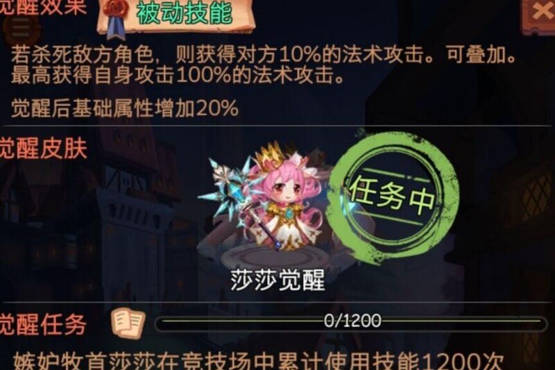 莎莎输出能力强,竞技场中通常只能释放三到四次技能,因此完成觉醒任务大约需要两至三周时间。