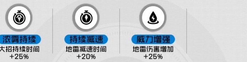 推荐搭配:必选浓雾持续,强烈建议搭配持续减速与威力增强,其余可选天赋中优先考虑充能加速以提升整体作战效率。