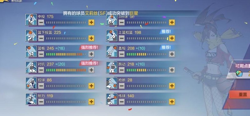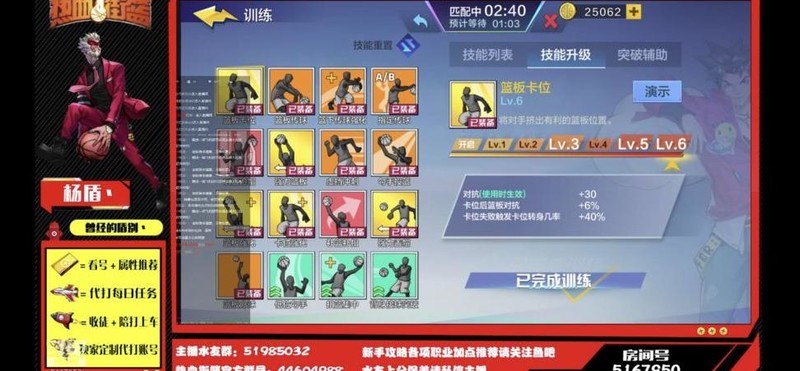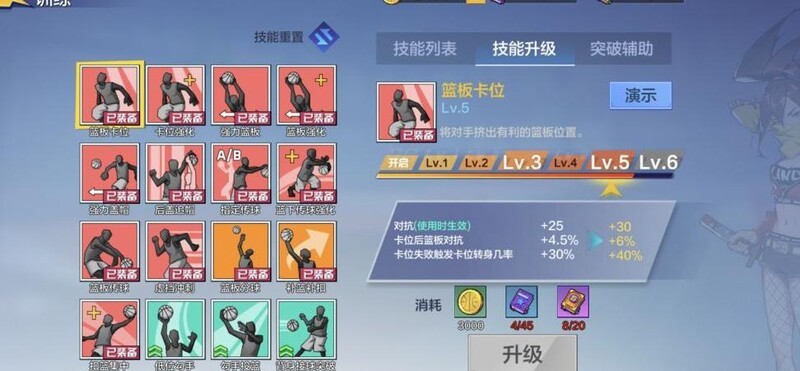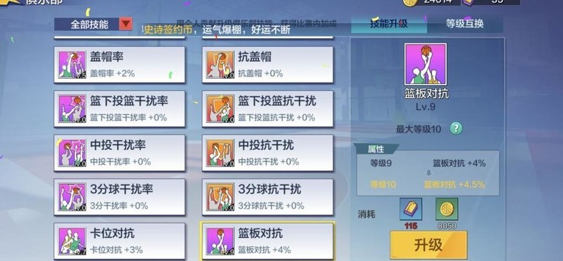 许多玩家容易忽视俱乐部技能带来的增益效果,认为初期一二级技能仅提升零点几个百分点的属性,实际随着等级提升,其成长性非常可观,到八九级时单项加成可达4%以上。更要清楚的是,这类属性属于比例型增益,会随角色自身属性的提升而同步放大。在技能加点策略上,建议优先投资卡位对抗和篮板对抗,以增强内线争夺能力。由于笔者已将望月樱突破至S级,对抗属性相对充足,因此更侧重于提升篮板相关技能,待基础等级提升后逐步投入盖帽率。进入后期阶段,可根据战术需要选择中投干扰、三分干扰等防守类技能进行补充。以下为个人技能加点方案,供各位参考借鉴。