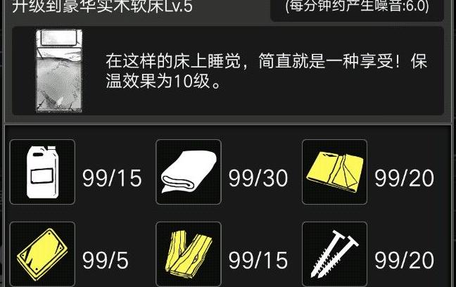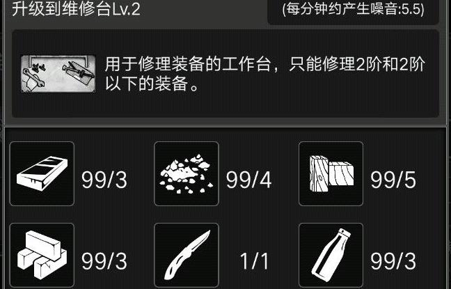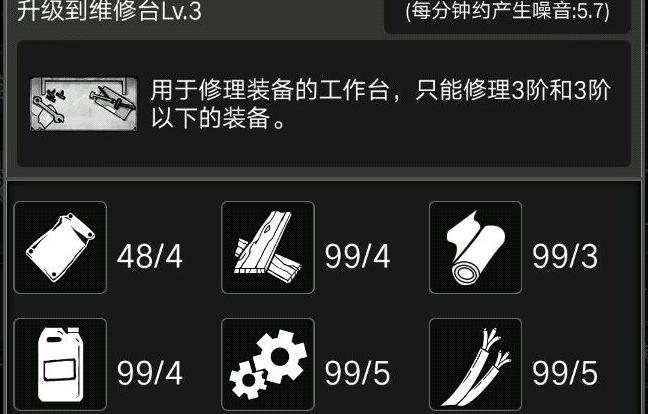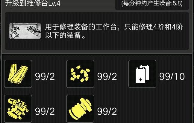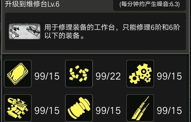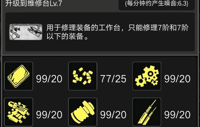 该建筑属于后期必备设施,约70天即可快速提升。对武器维修至关重要,但7级升级耗材较多,难度较高,且7阶装备获取不易。建议在资源充足或实际需要时再进行升级,以确保效率与投入的平衡。