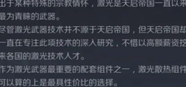 令人遗憾的是,关于激光散热组件的具体运作原理,天启帝国始终守口如瓶,未作任何披露。然而,从零星信息中仍可提取出若干线索。据诺兰德特工回忆,他曾向一位名为穆台阿?阿戈亨的天启巡洋舰长提问,为何该帝国对激光武器情有独钟。对方回应称:激光由最纯粹的能量构成,被其蒸发者,将亲历真神之怒与信仰之圣洁。对此言论,我持中立态度。尽管因宗教信仰而约束科技发展方向在理性层面难以认同,但必须承认,宗教正是天启帝国存在的根基,其一切选择皆源于此信念体系,因而也显得顺理成章。