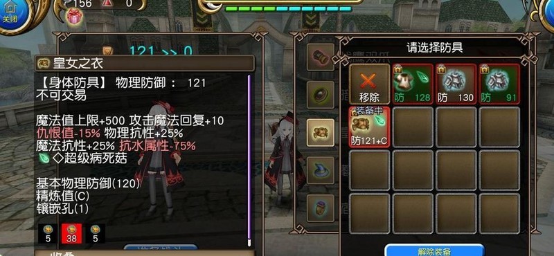 装备选择王掉皇女套,10点攻击力回复手感舒适,但75抗水削减略显尴尬(曾因此被狗怪一击毙命)。王石推荐搭配病死菇使用。