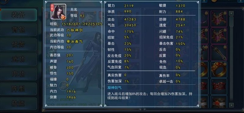 无名搭配六脉神剑,无需玉女素心剑或灭绝剑法,配合寒冰内功(没错,正是A级内功),攻击力达4.1万,辅以龟猪双特技神宠(单特技C级猪也可替代),触发晕眩效果即占优势,性价比极高,实战表现强势。