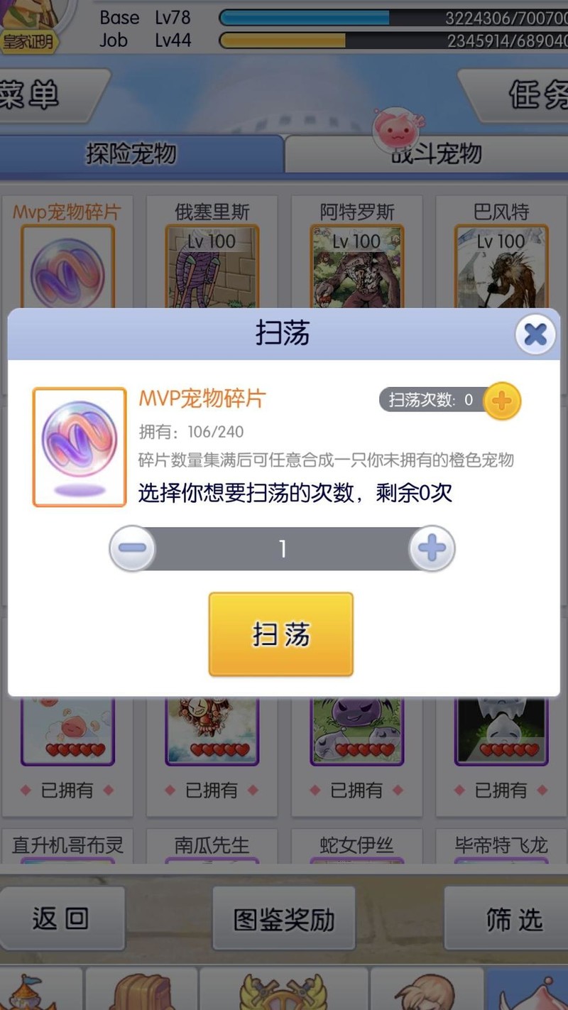 通关400关后将解锁MVP碎片系统,可用于兑换部分橙色品质宠物。建议每日在三次免费扫荡基础上额外购买两次MVP扫荡(共消耗50钻石),以显著提升橙宠获取速度。扫荡时优先选择尚未拥有的最低稀有度宠物,因为当某稀有度的全部宠物集齐后,商城会自动解锁更高一级稀有度的宠物奖励,合理规划可加快收集进度。