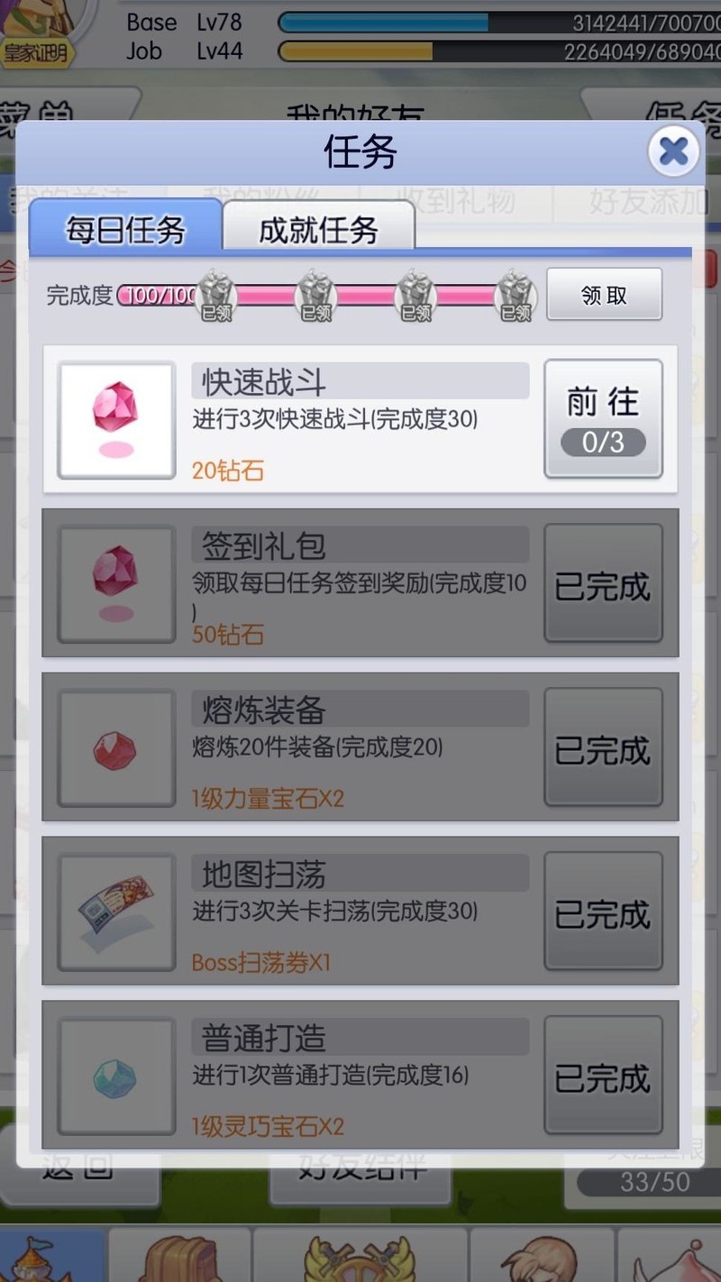 点击进入后完成签到操作,除快速扫荡外的所有日常任务均需完成,其中装备精炼可用强化神格任务替代,具体所示。