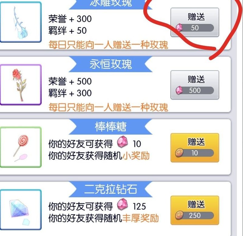 好友赠送50钻玫瑰可获得萌新荣誉点,这是解锁技能的主要途径。操作步骤:进入好友列表,点击赠送按钮,选择50钻玫瑰完成赠送即可。