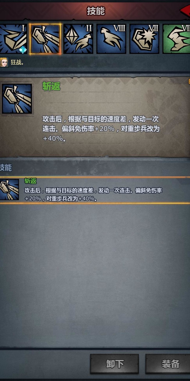 被动技能:反击斩、连续两次攻击,生存力强,对抗重装步兵时减伤效果更佳。