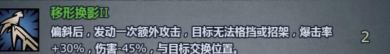 技能二名为移形换影,可在闪避时触发反击,使目标无法招架或格挡,同时提升自身暴击率、降低所受伤害,并与敌人交换位置。效果看似华丽,实则实用性低。由于当前版本偏斜免伤已被削弱至90%,无论在要塞战斗还是高盾任务中,该技能都极不稳定,极易导致角色陷入危险境地,频繁使用反而容易造成意外阵亡。