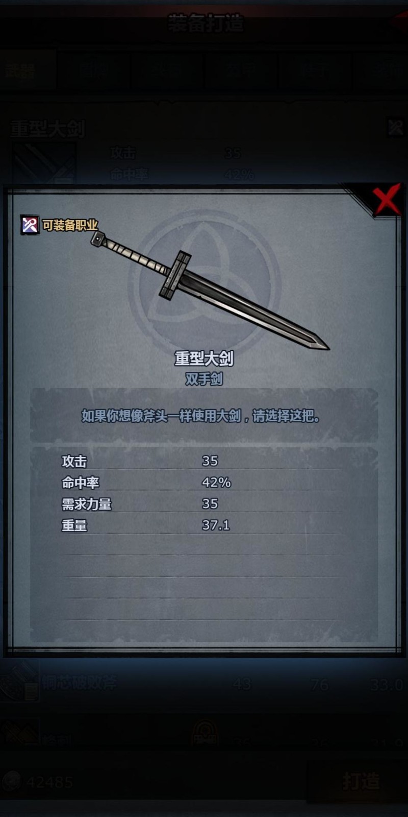 这把重型大剑性能尚可,重量适中,性价比不错。可惜需大量精钢打造,成本较高。若条件有限,建议选用单手剑更为合适。