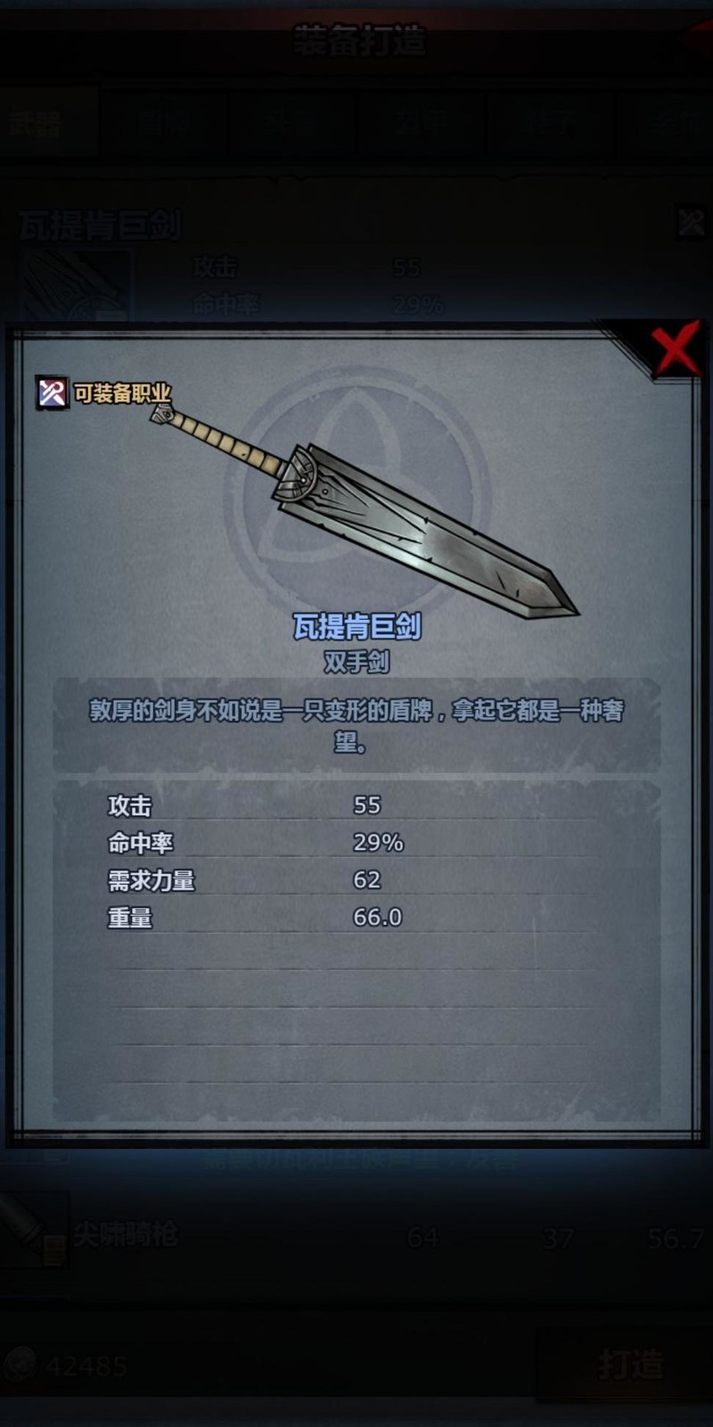瓦提肯巨剑:大剑终极装备,极为沉重,当前攻击力顶尖,虽神器已出,具体数值尚不明确。