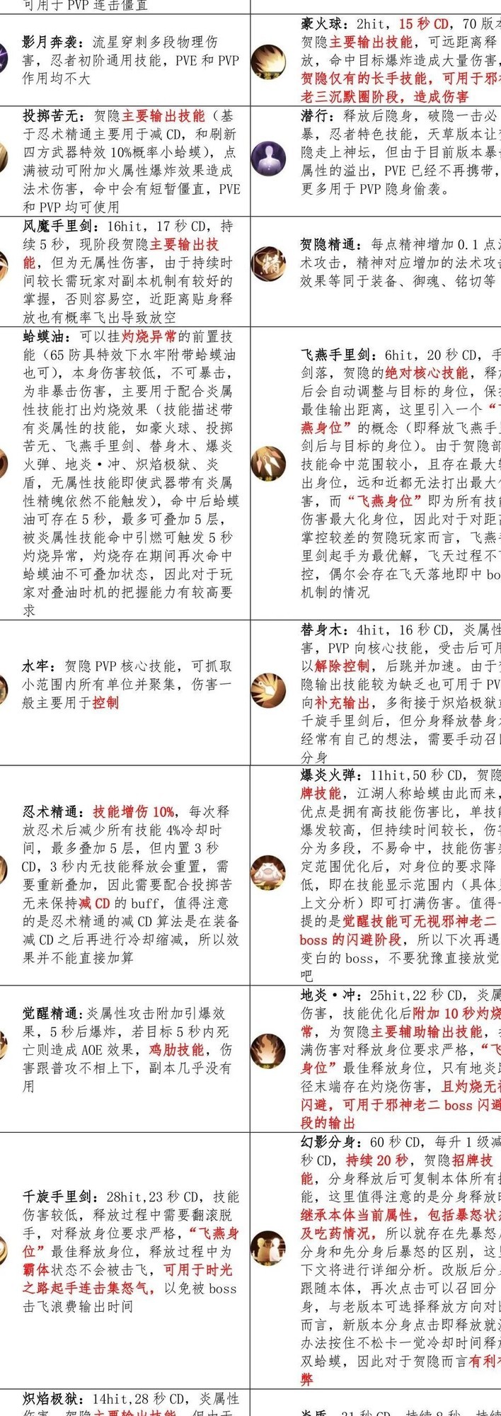 作为一名合格的贺隐使用者,必须对飞燕身位有敏锐的判断力,因为地炎·冲和千旋手里剑在该位置可实现伤害最大化。为追求极致输出,建议以暴怒蛤蟆起手控制敌人,并遵循分身期间尽可能多释放技能的原则。豪火球、飞燕手里剑、风魔手里剑与千旋手里剑的冷却时间分别为15秒、20秒、17秒和23秒,在搭配忍术精通及武器提供的减CD增益后,恰好能在分身持续的20秒内完成两次完整循环。针对当前主流的黑夜十握贺隐配置,在PVE场景中推荐采用以下技能组合,以确保输出流畅且伤害集中,充分发挥角色爆发优势,实现高效刷图与Boss战中的稳定表现。