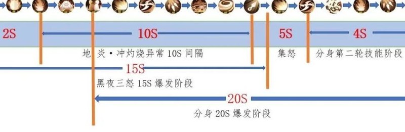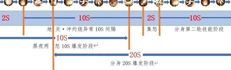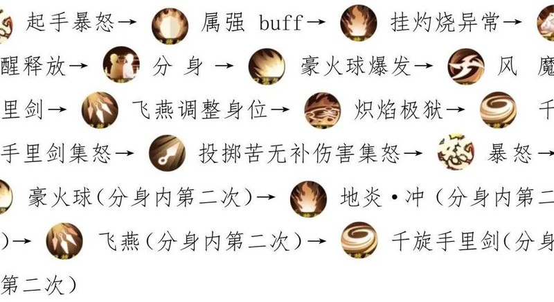 起手使用暴怒配合地炎·冲施加灼烧效果,可在20秒内实现贺隐的最高输出。在怒气即将结束时释放千旋手里剑,既能迅速积攒新怒气,又不浪费暴怒期间的伤害。分身持续期间,合理穿插两次豪火球、风魔手里剑、飞燕手里剑与千旋手里剑,充分提升技能覆盖率,使分身效益达到最优,整体输出节奏紧凑高效。