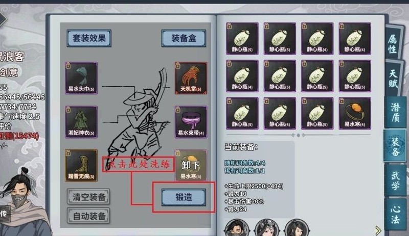 进入锻造界面可进行洗练操作,可通过行囊中装备选项进入。建议指定一名侠客穿戴待洗装备,便于快速定位和管理,提升操作效率与便捷性。