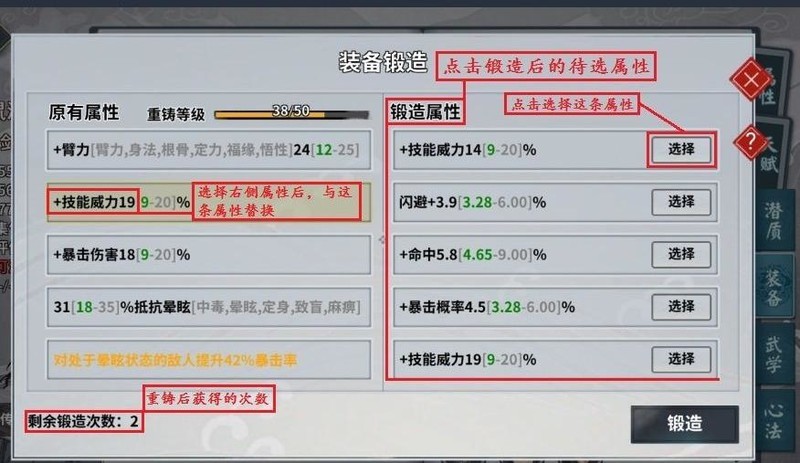 点击重铸获取锻造次数,显示锻造后点击属性后的锻造按钮即可。