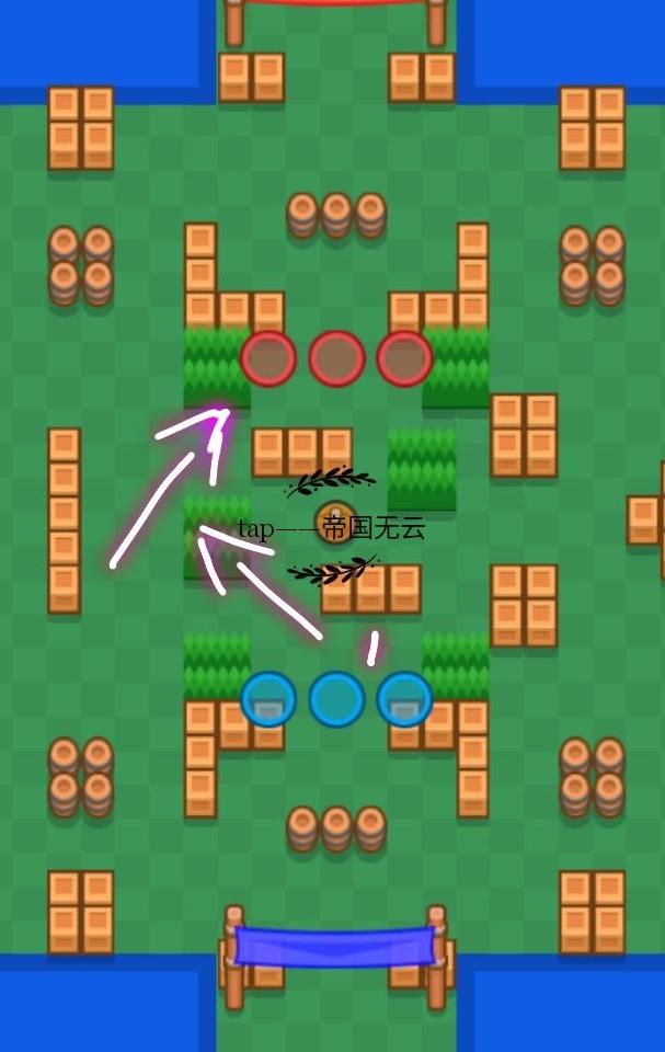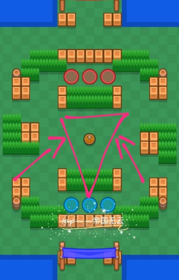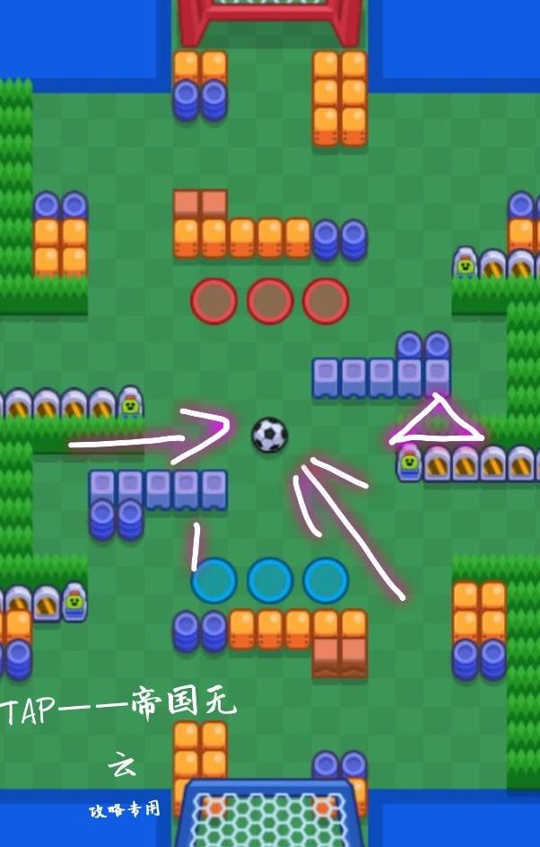 另外两名英雄可沿侧边箭头方向发起压制性进攻。尽管球门前设有狭长的障碍物,但若敌方拥有破墙英雄,该屏障一旦被摧毁,球门区域将变得极为开阔。因此,在进攻时必须优先破坏对方球前障碍,同时严密防守,确保我方球门前的掩体不被对方击破,以维持攻防平衡。