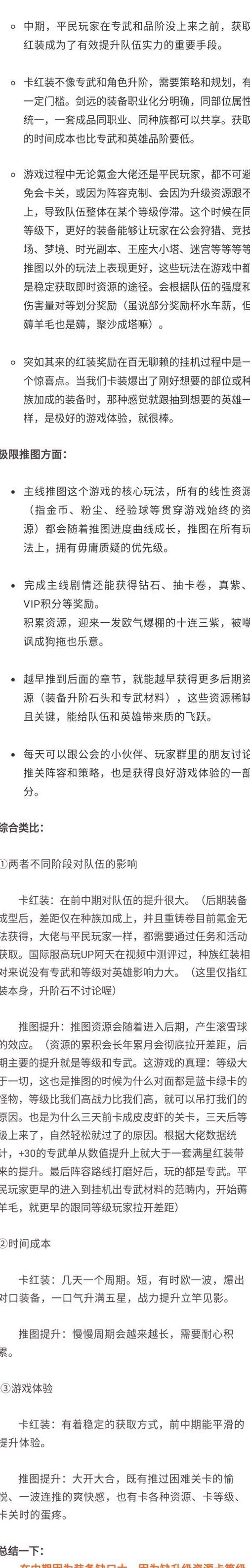 此前分享了一则关于装备优化的小建议,收到不少朋友反馈,其中不少人询问红装培养与推图进度该如何权衡。为此我参考了相关视频和攻略,并结合个人理解进行了整理与分享,也感谢协助排版的朋友们。