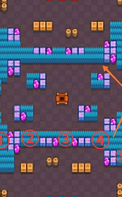 左侧近战优势路的核心在于,一旦成功进入敌方半区,近战英雄可借助地图中大范围的草丛隐蔽身形,从而对敌方边路与中路形成持续威胁。然而,如何在不被远程频繁消耗的情况下安全抵达对面区域,非常考验走位技巧。对于新手而言,选择机动性强的普里莫是理想方案,通过灵活的蛇形走位从2号口出发,逐步推进至敌方领地。右侧则是远程的优势路线,通常从3号或4号口出门,开局时先向中路草丛发射一发技能,实现探视野与压血线双重目的。随后退至红圈标记位置,沿红线方向持续输出,不断调整角度进行骚扰压制。当对手血量不足被迫后撤时,便可进一步限制敌方中路活动。右侧之所以更具优势,是因为在此位置能更好地利用掩体向左延伸藏身,提升生存能力。若处于1点位置,则掩体稀疏,容易暴露,只能被动后撤或向中路靠拢,不仅压制力下降,还可能因两名远程集中攻击中路密集区域而大幅增加误伤概率。
