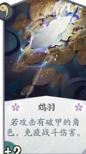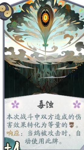鸩的卡牌在前期依靠鸩羽打出4点伤害,提升了交换能力;中后期配合队友破甲可实现无伤输出,表现亮眼。但其自身仅有一张毒蚀能为式神提供破甲,略显不足,整体而言仍属值得携带的选项。