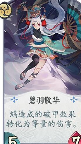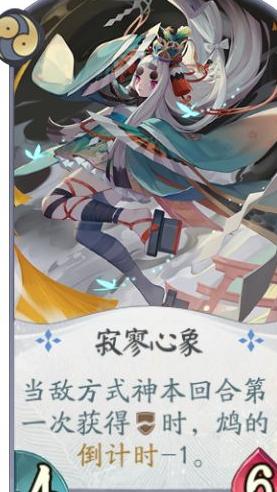 这张卡牌拥有4/6的身材并附带特殊效果,属于中规中矩的式神形态。其特效为:当敌方式神首次破甲时,可使鸩的倒计时减少1点,配合队友的破甲手段能有效加速被动触发。同时,自身较高的攻防值也能在战斗中打出可观伤害,具备一定进攻能力。然而由于鸩的卡位较为紧张,实战中通常不会优先考虑携带此卡。